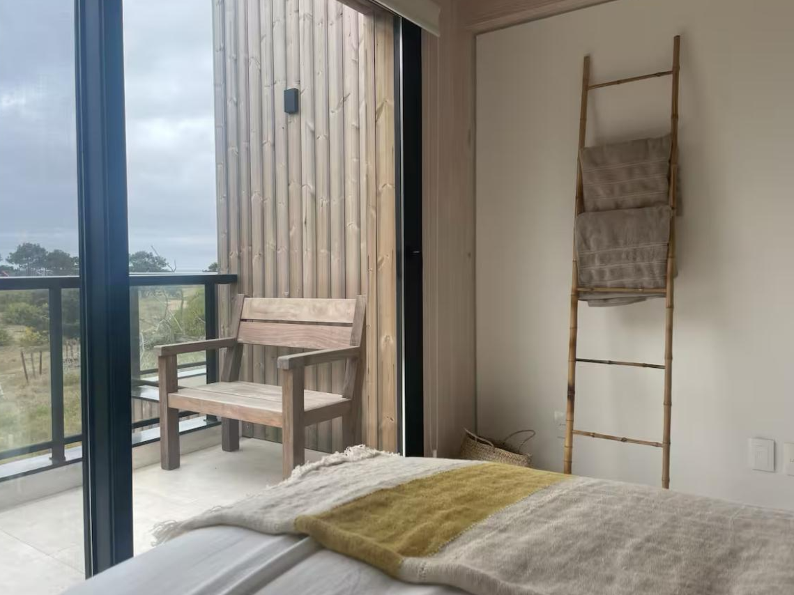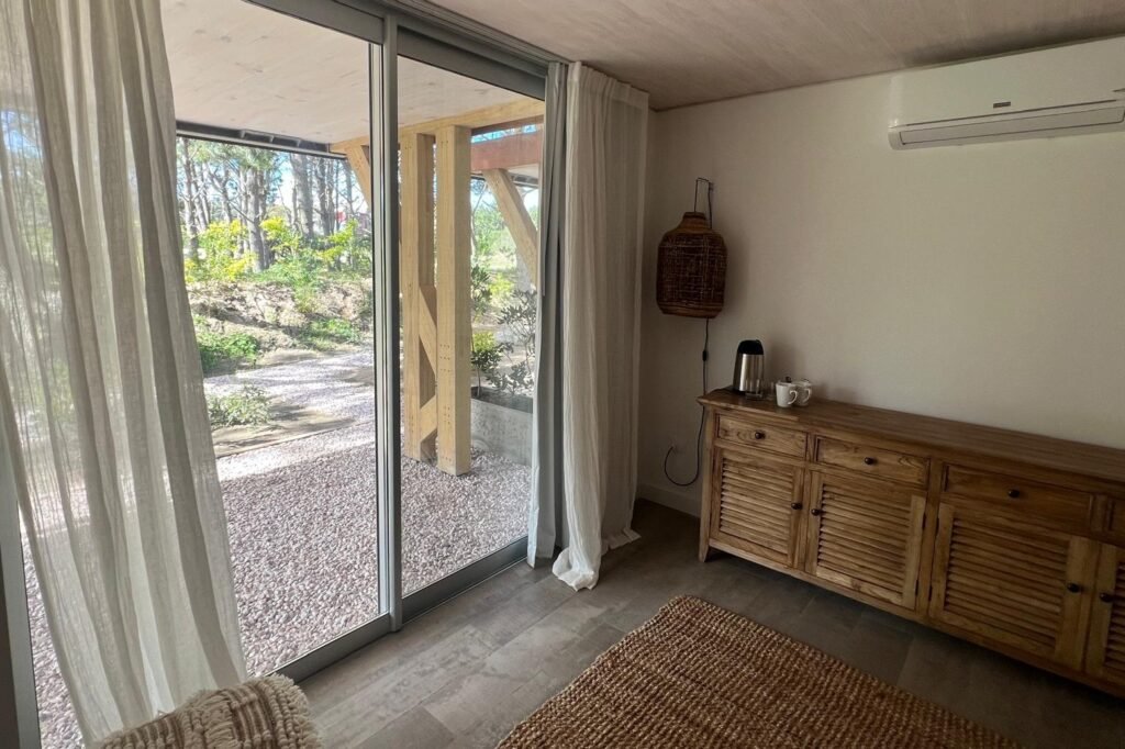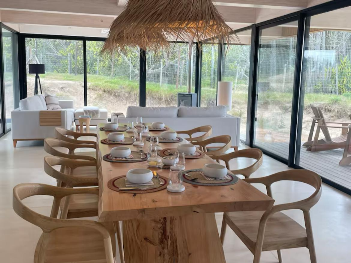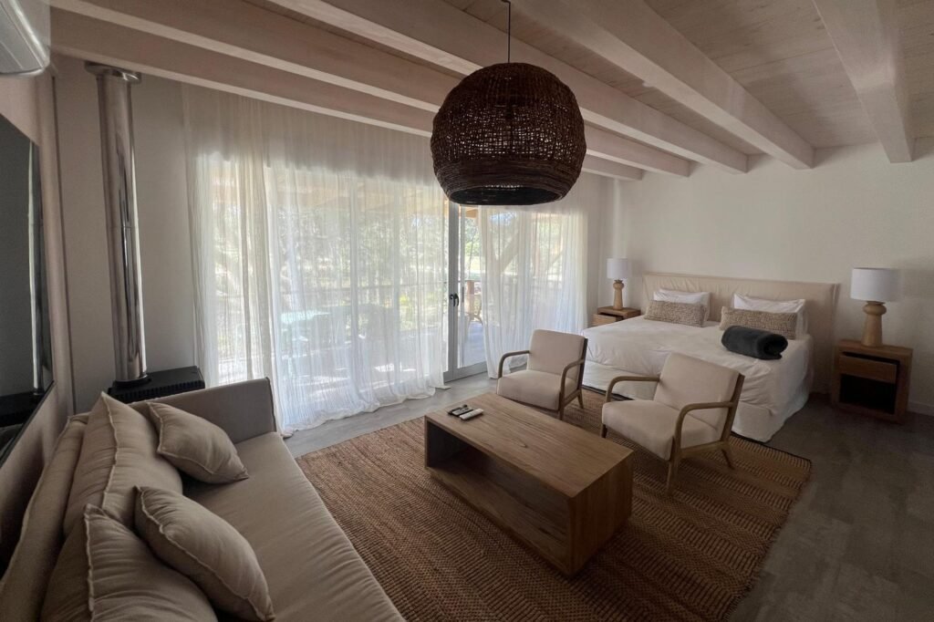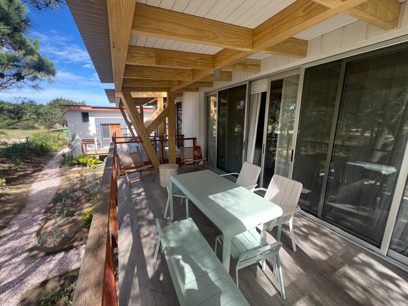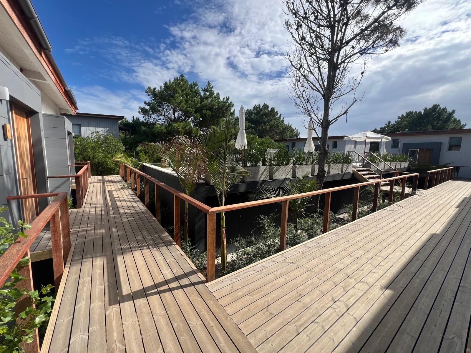 Hotel de 1200 m² en mass timber, con 5 villas de dos plantas en torno a una piscina central con borde infinito, deck y pasarelas en thermowood. Ejecutado en 8 meses.