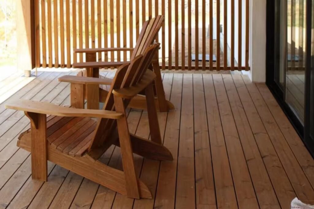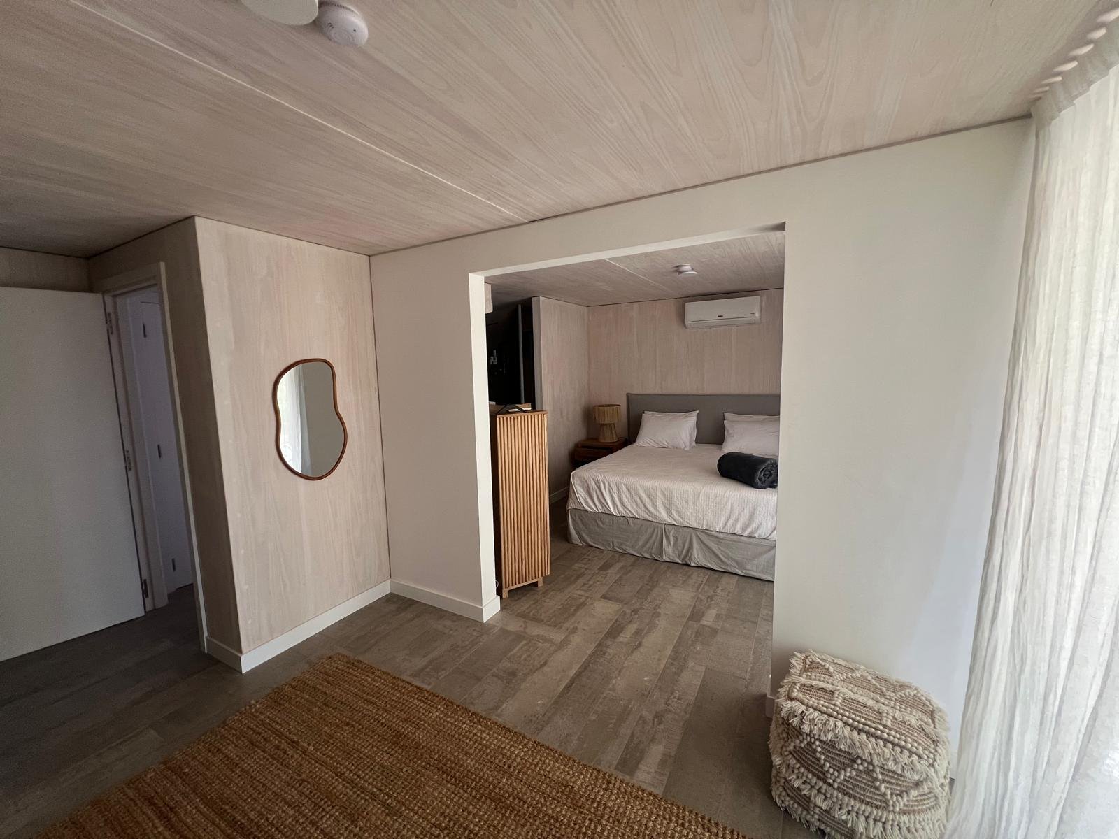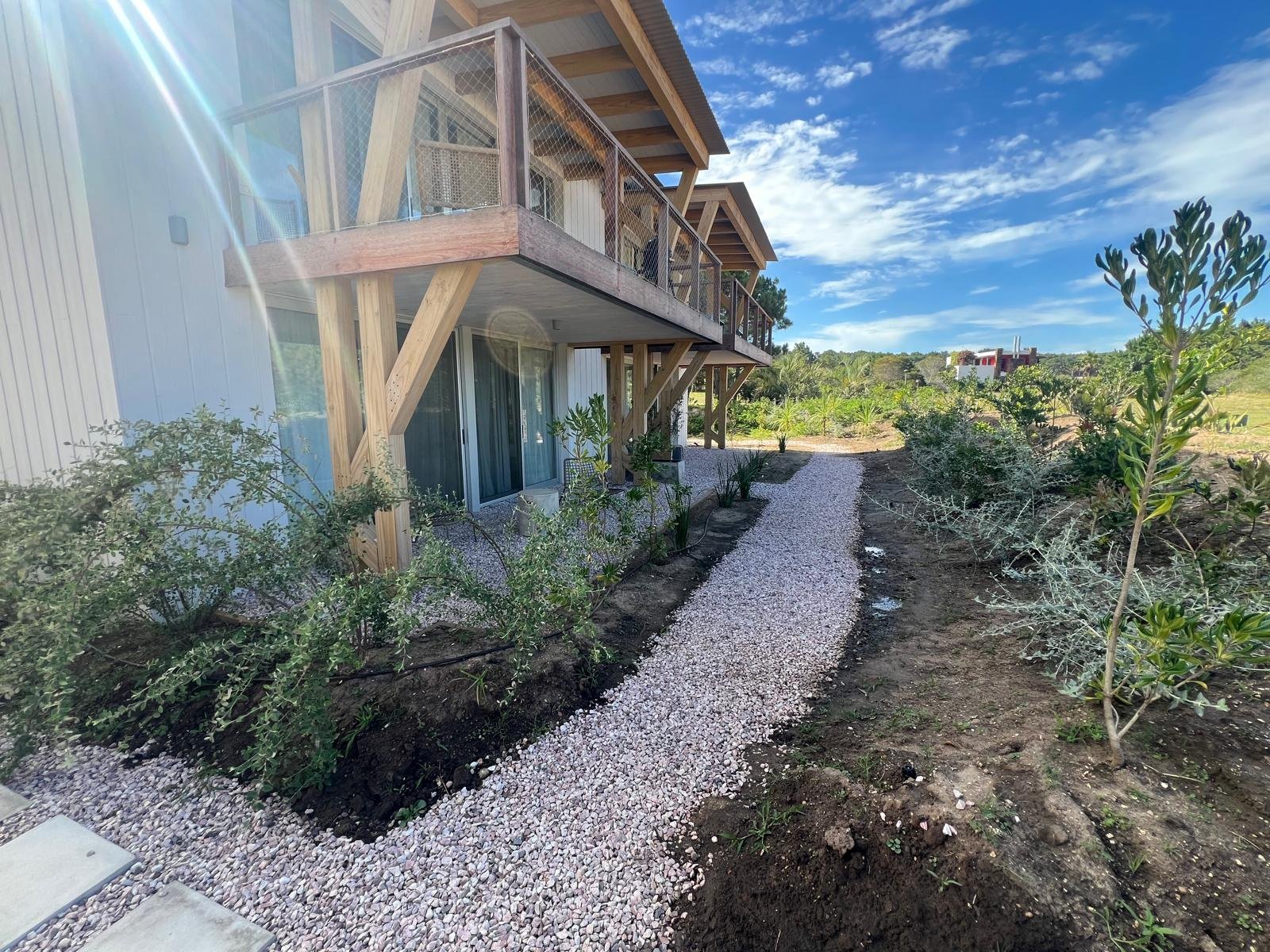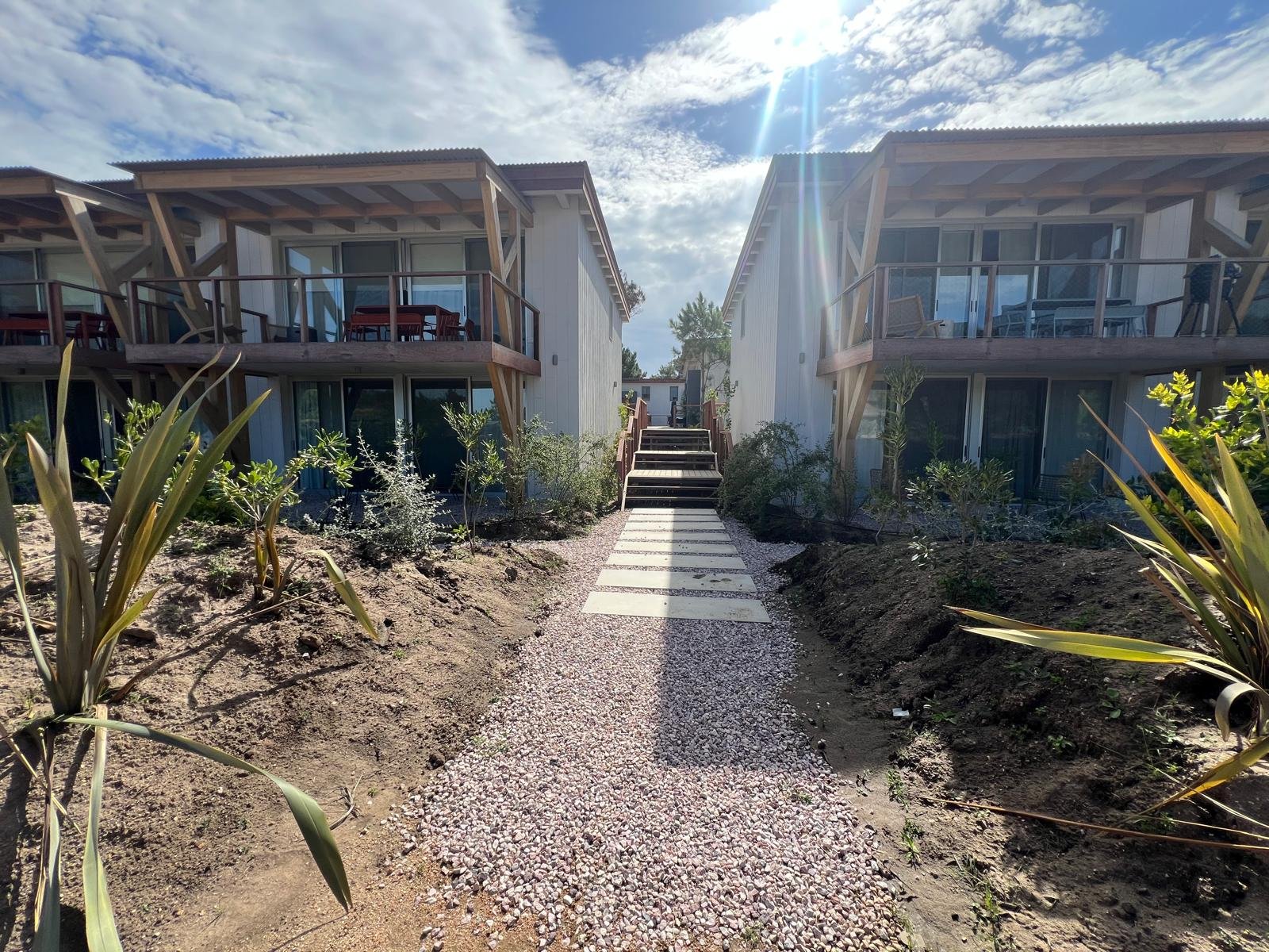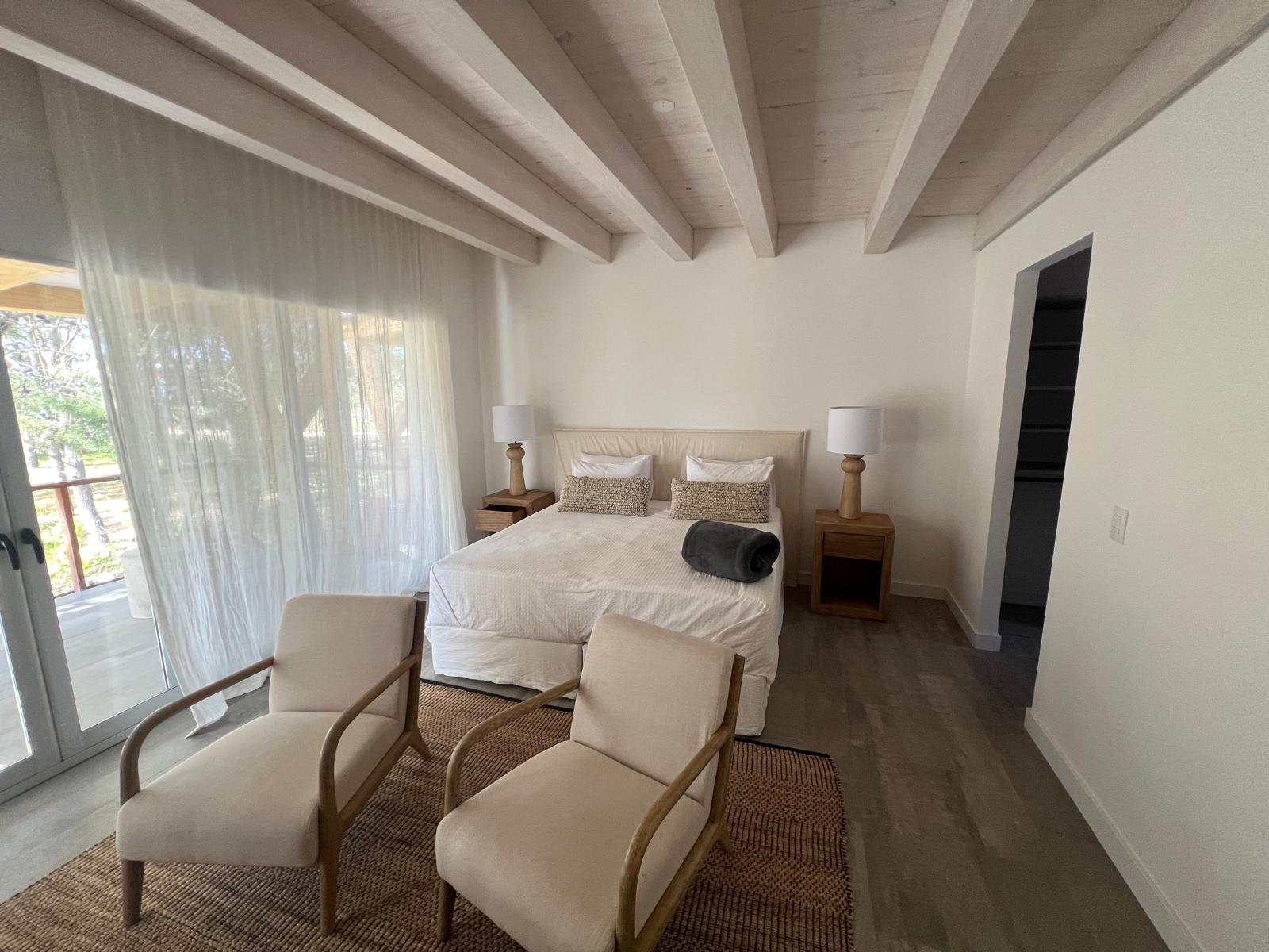 Hotel de 1200 m² en mass timber, con 5 villas de dos plantas en torno a una piscina central con borde infinito, deck y pasarelas en thermowood. Ejecutado en 8 meses.